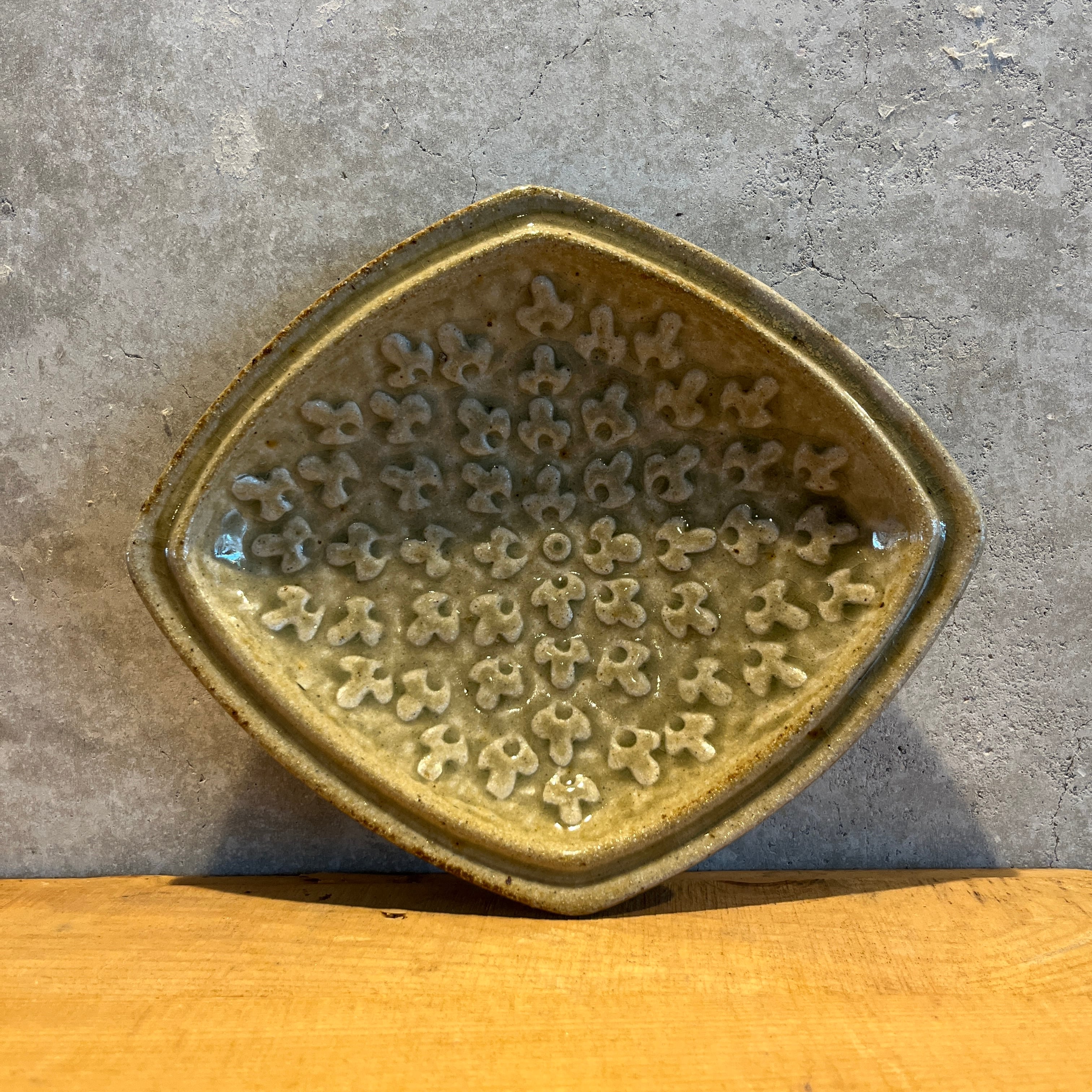 菱形をしたこちらの器は、凹凸ある模様が印象的。少しだけ脚がついているのもポイントです。食器としてだけでなく、アクセサリートレイとしても素敵です。