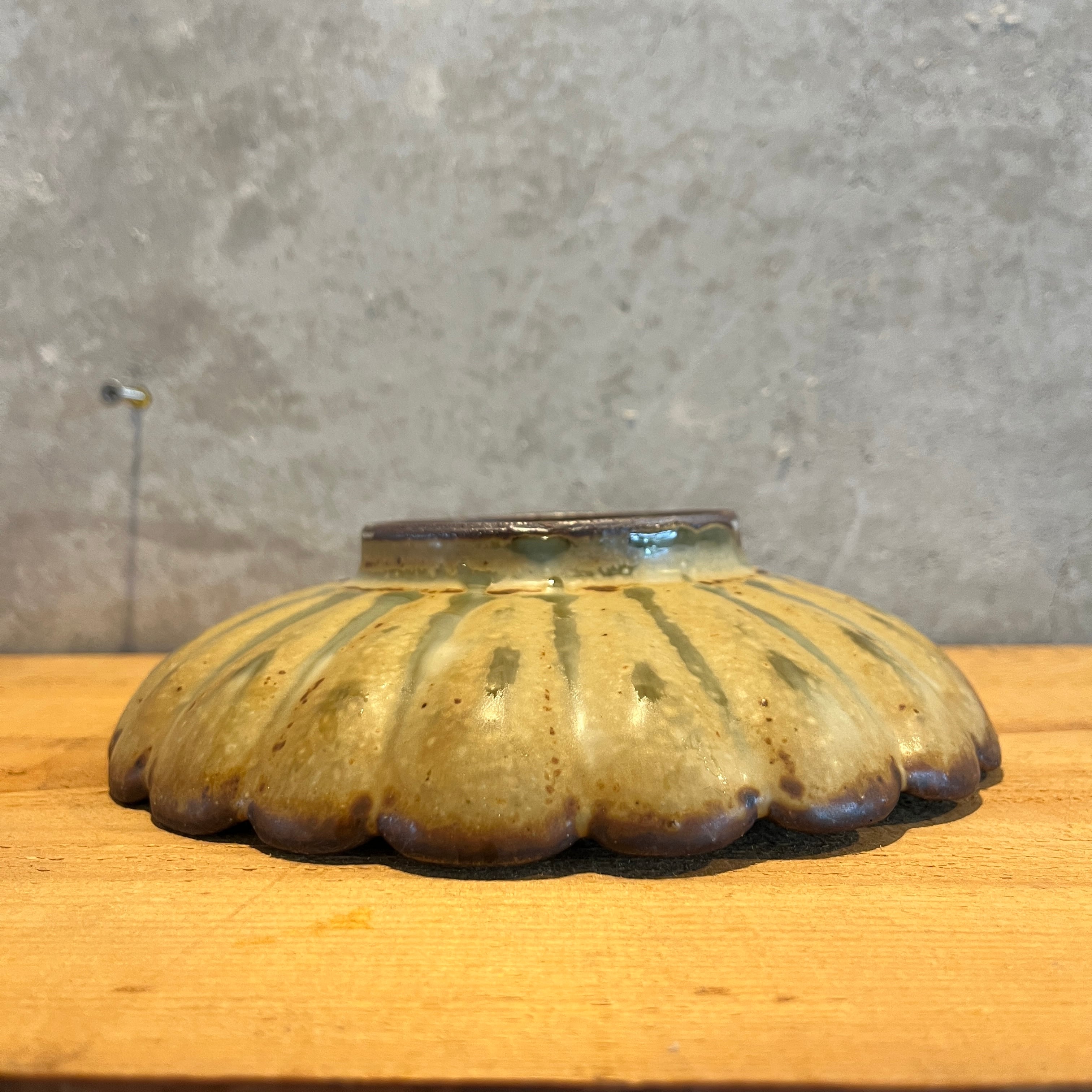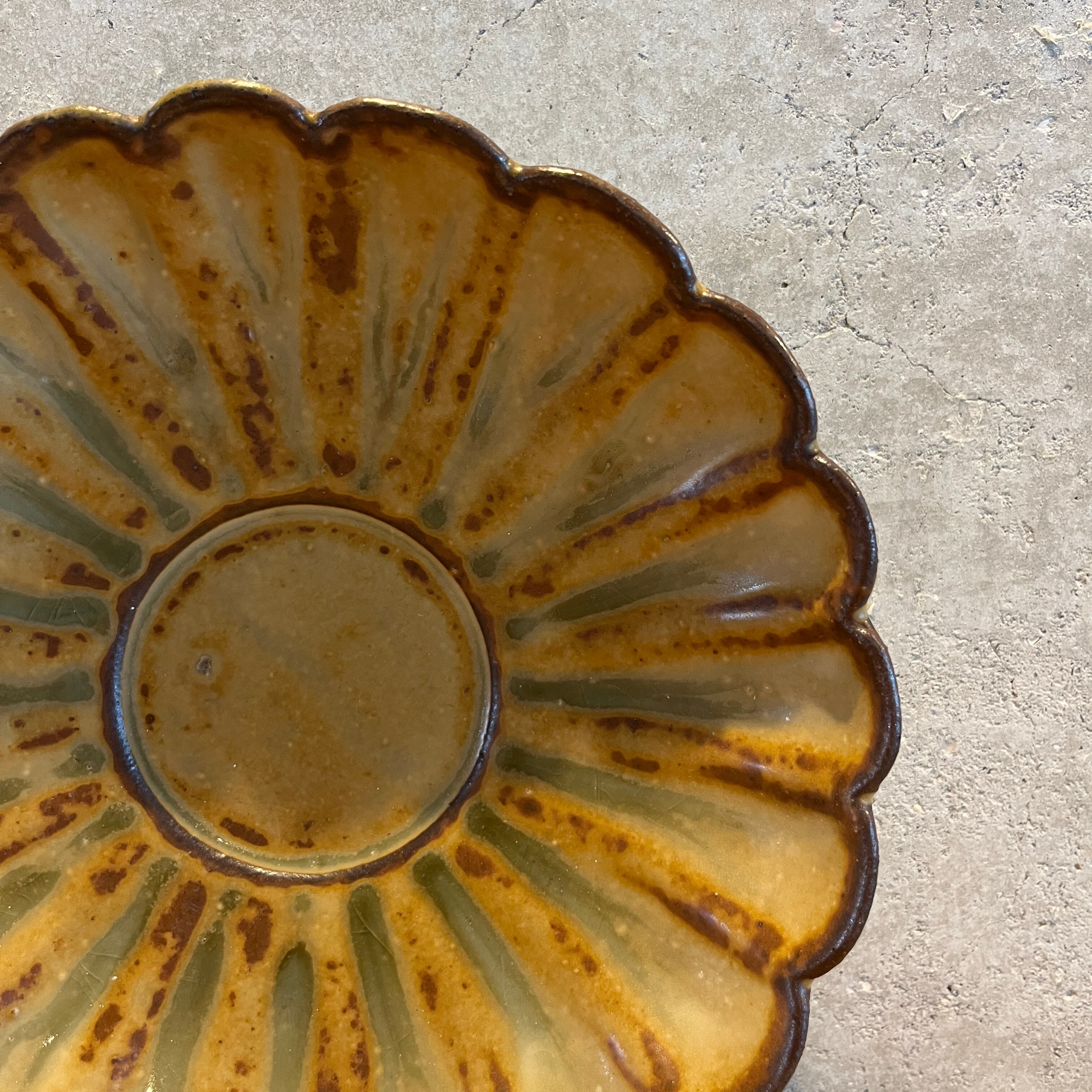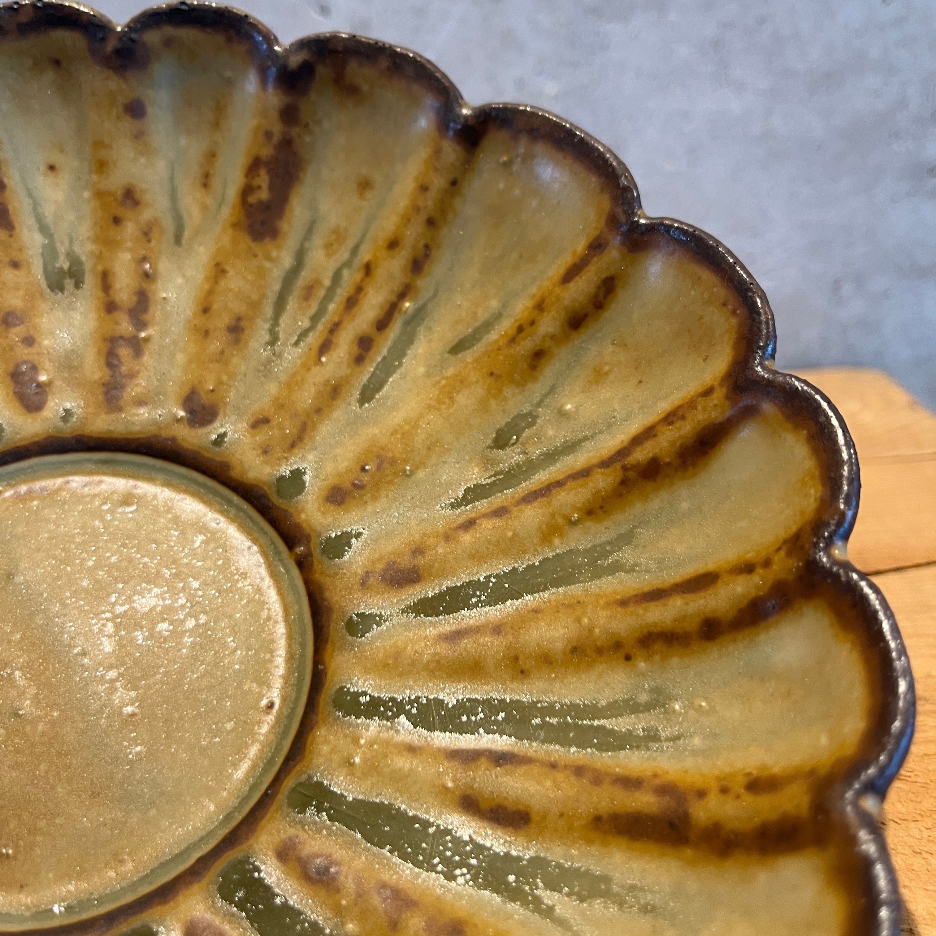 お花の形をした輪花皿。少し深さがあるので、汁気のあるお料理にも一役買ってくれます。1枚ずつ異なる表情の釉薬は、唯一無二の器です。