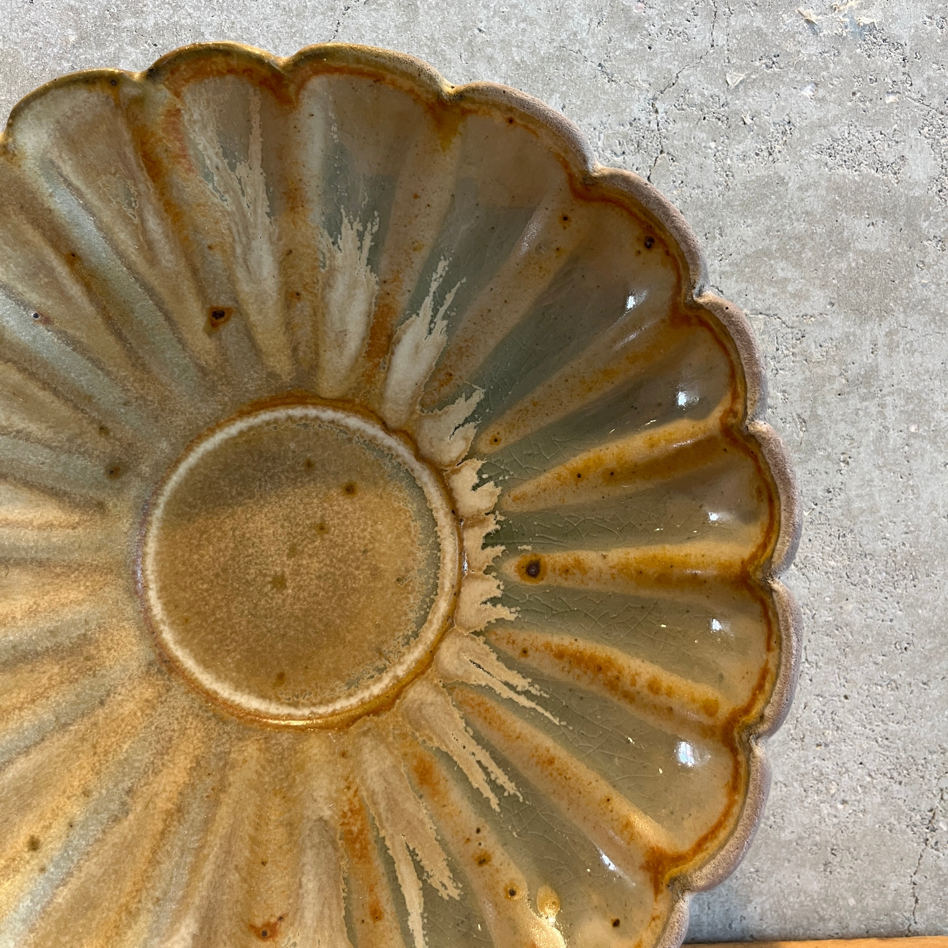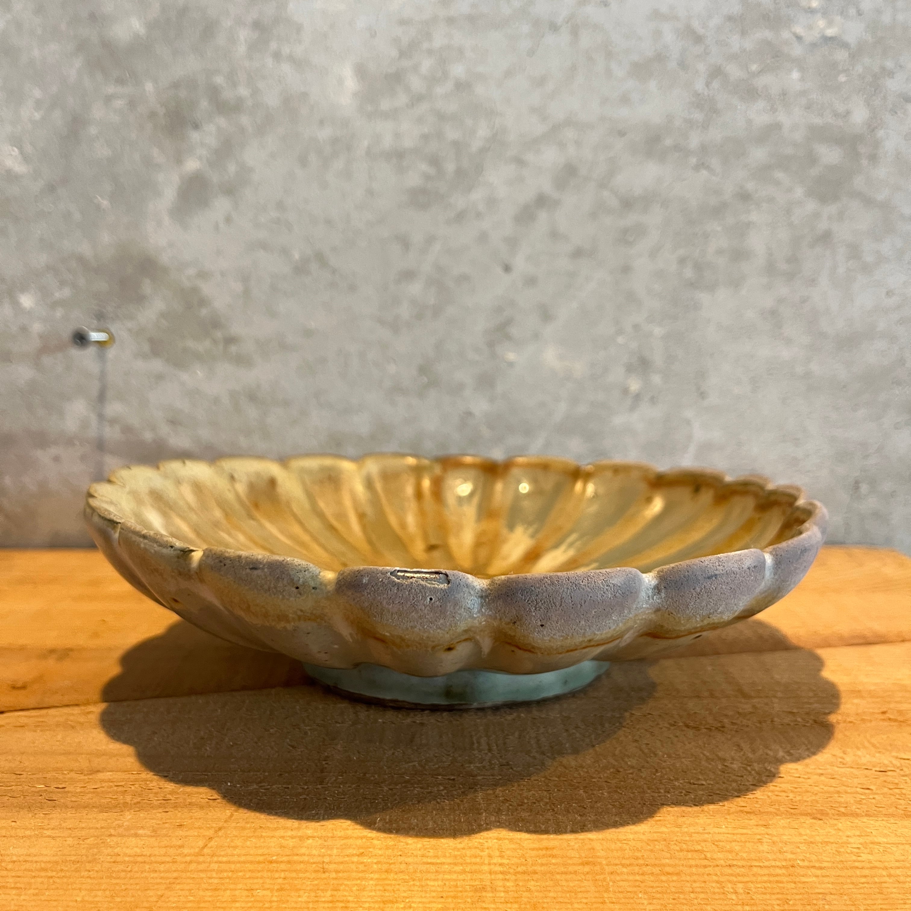 お花の形をした輪花皿。少し深さがあるので、汁気のあるお料理にも一役買ってくれます。1枚ずつ異なる表情の釉薬は、唯一無二の器です。