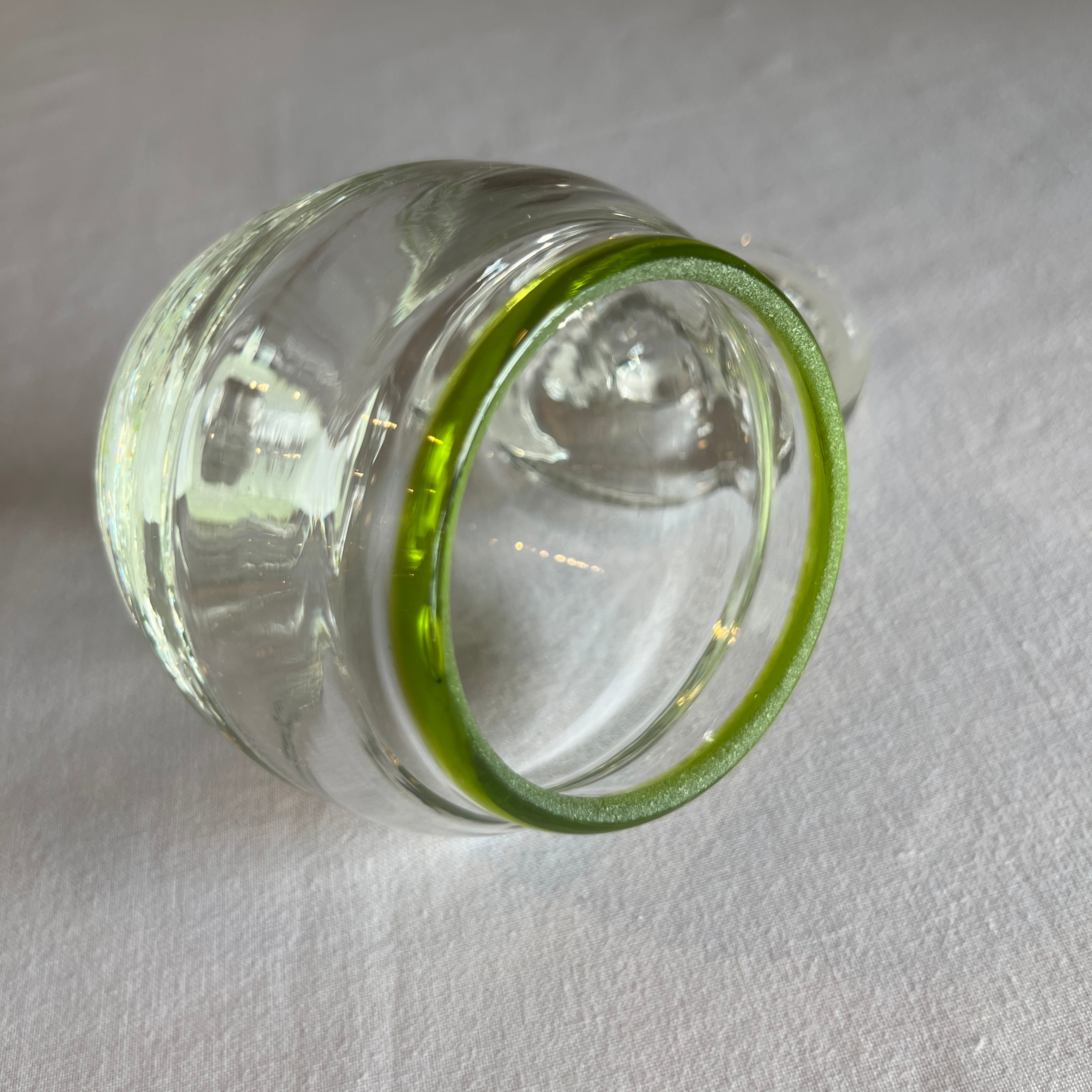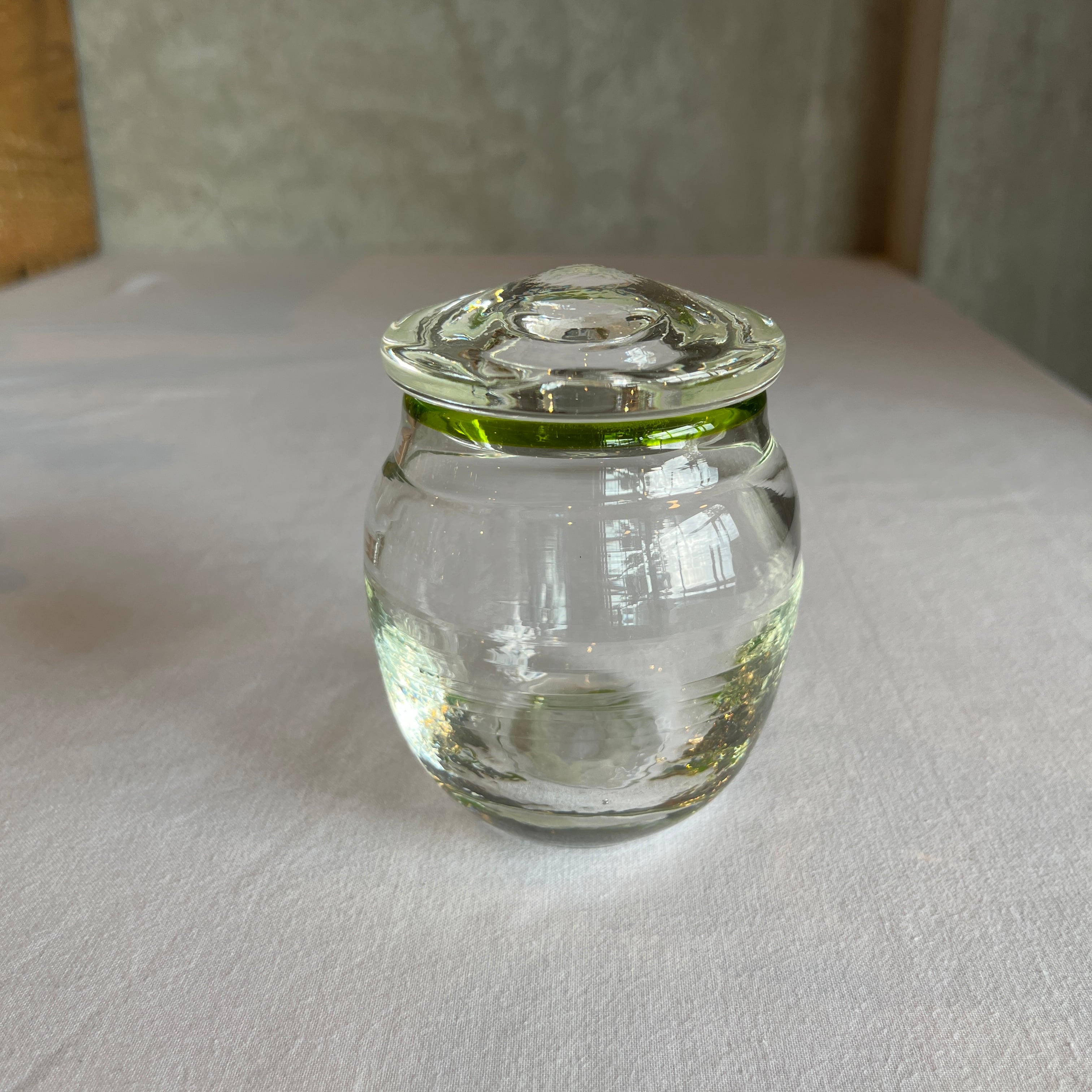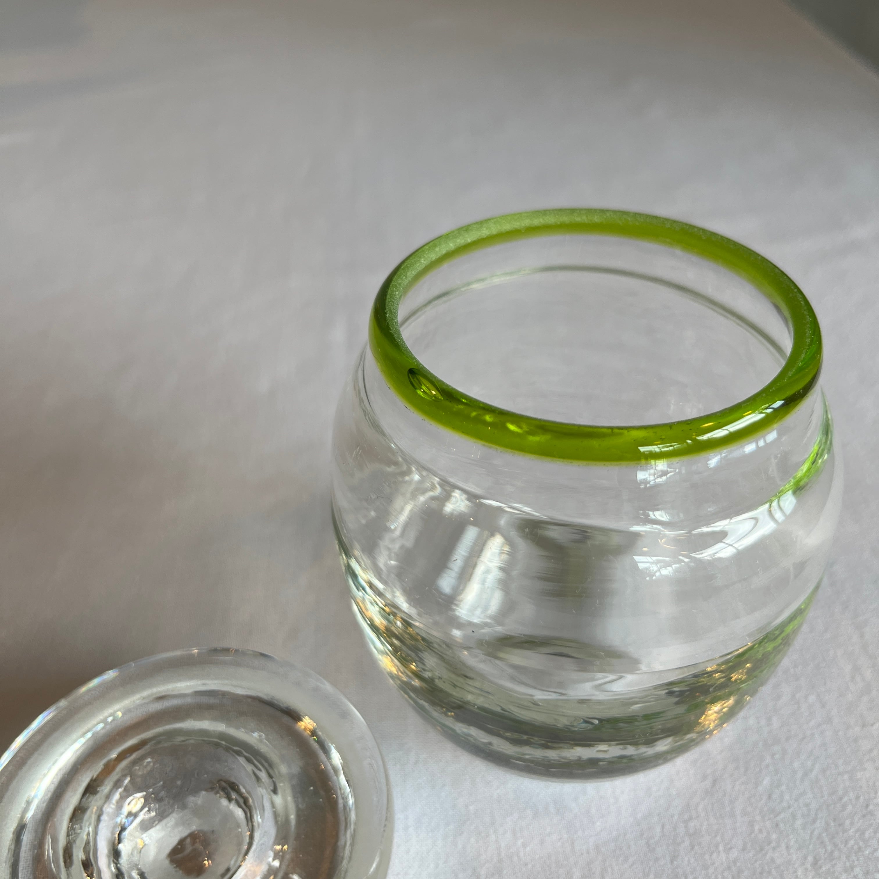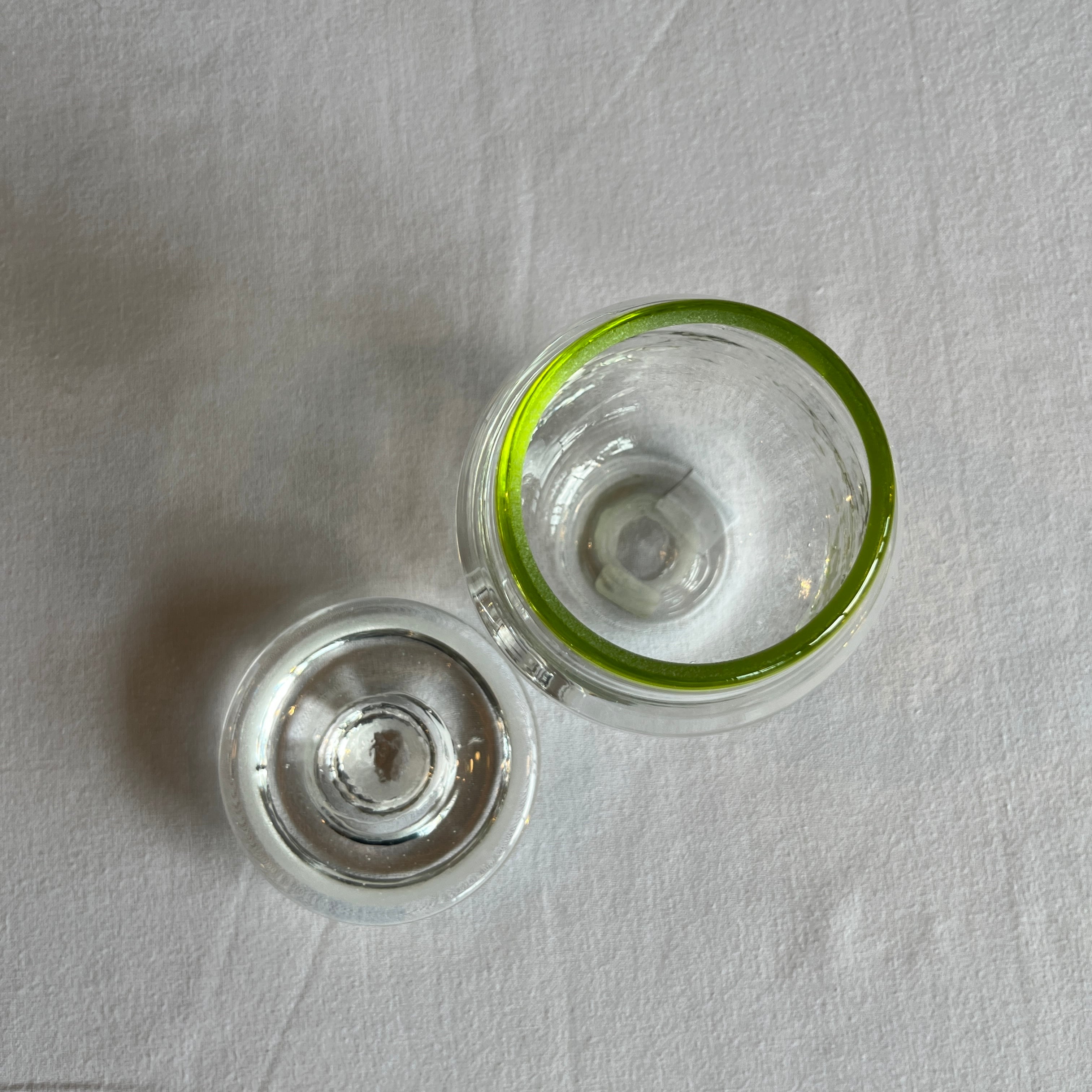 縁取りに鮮やかなグリーンがさりげない蓋物。キャンディやお漬物入れにどうぞ。