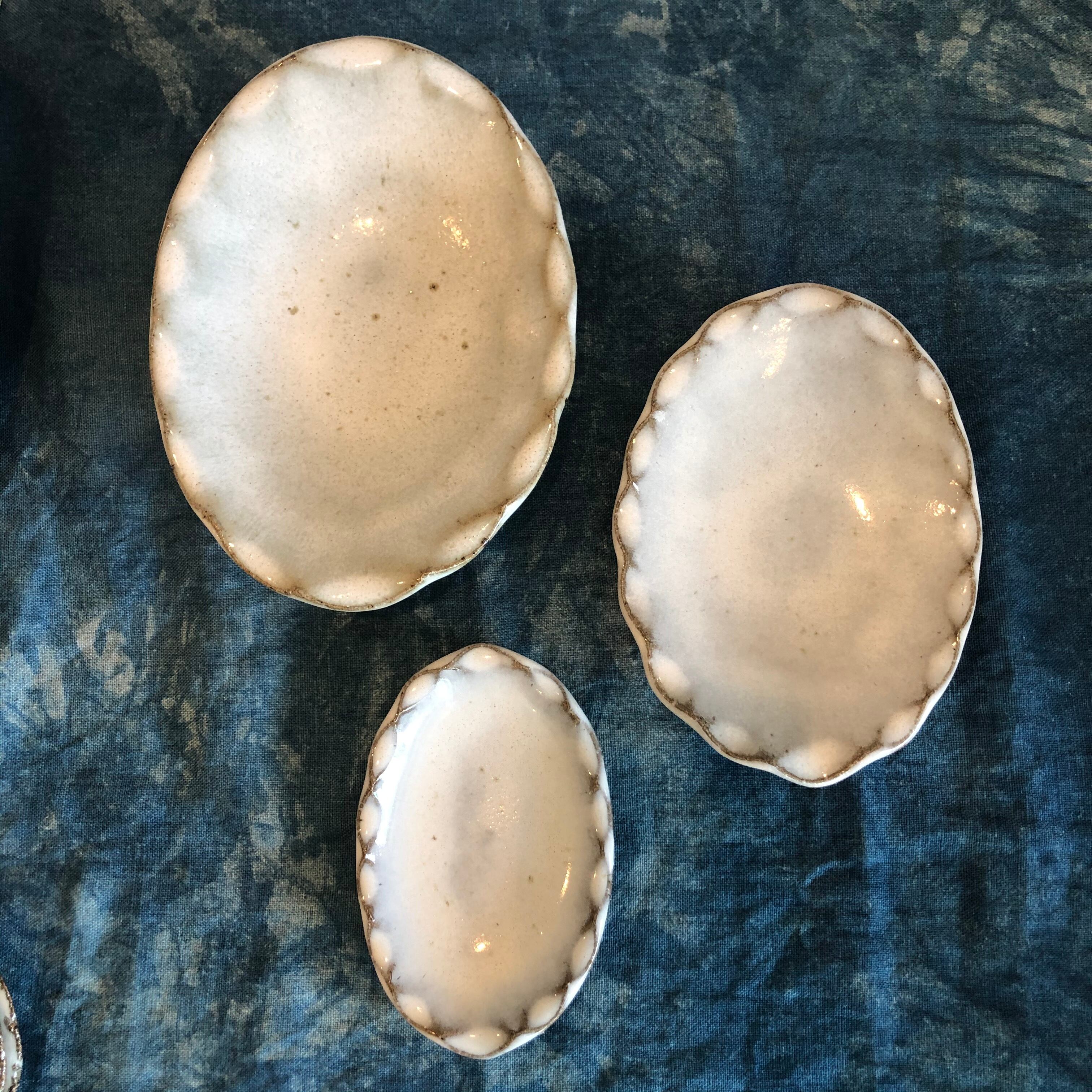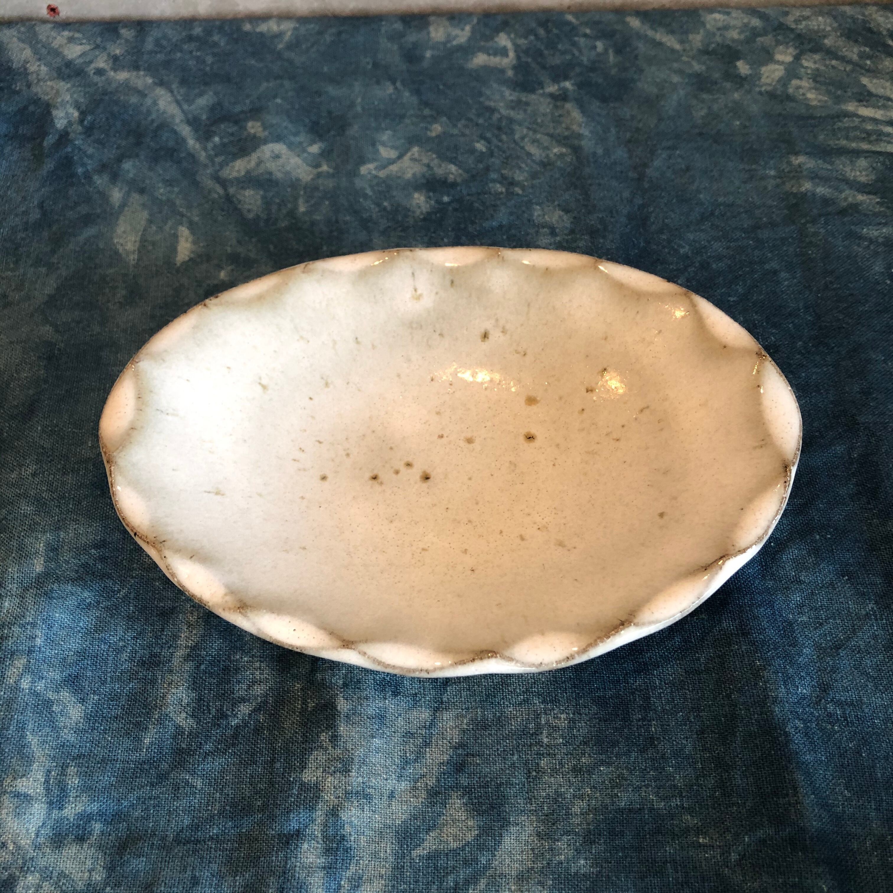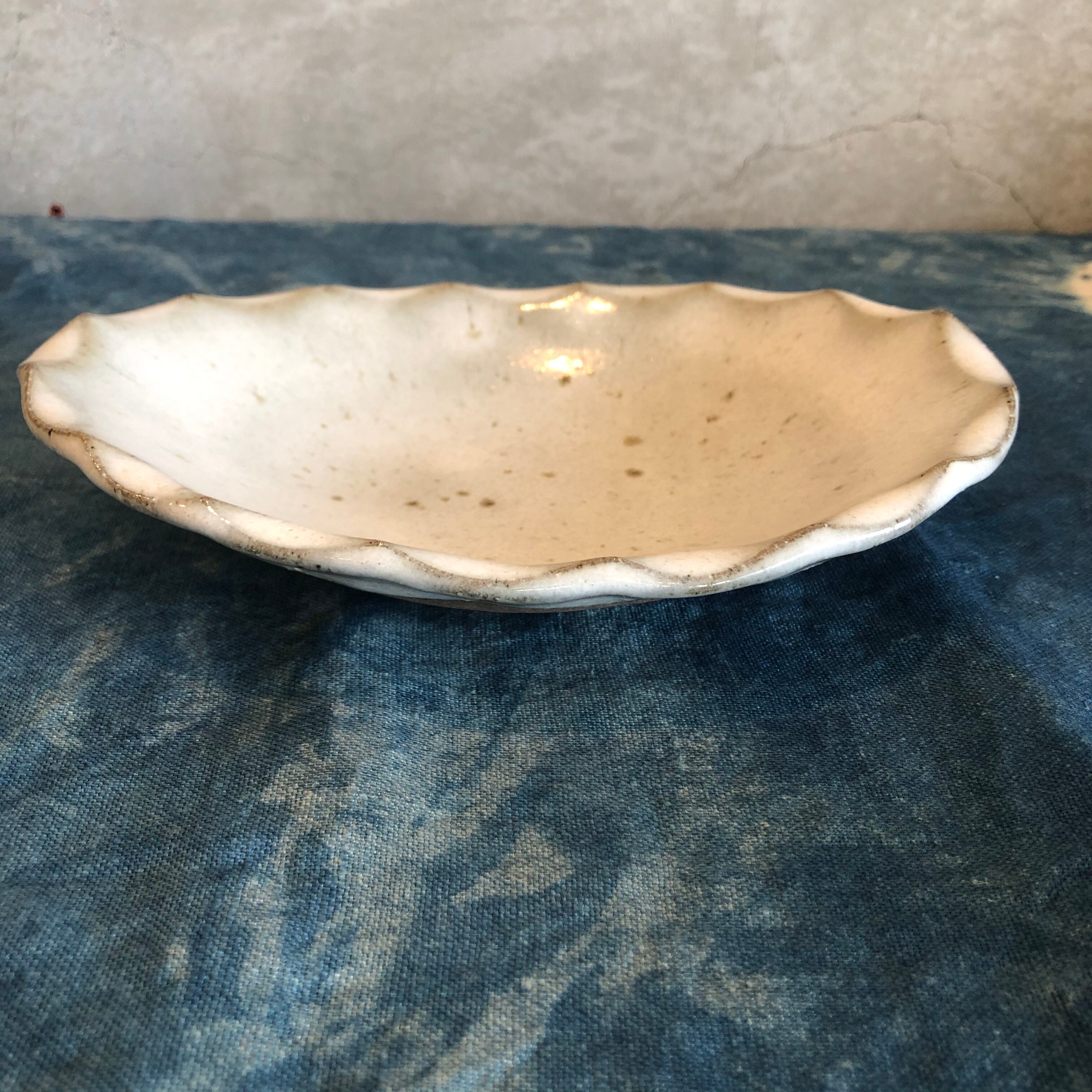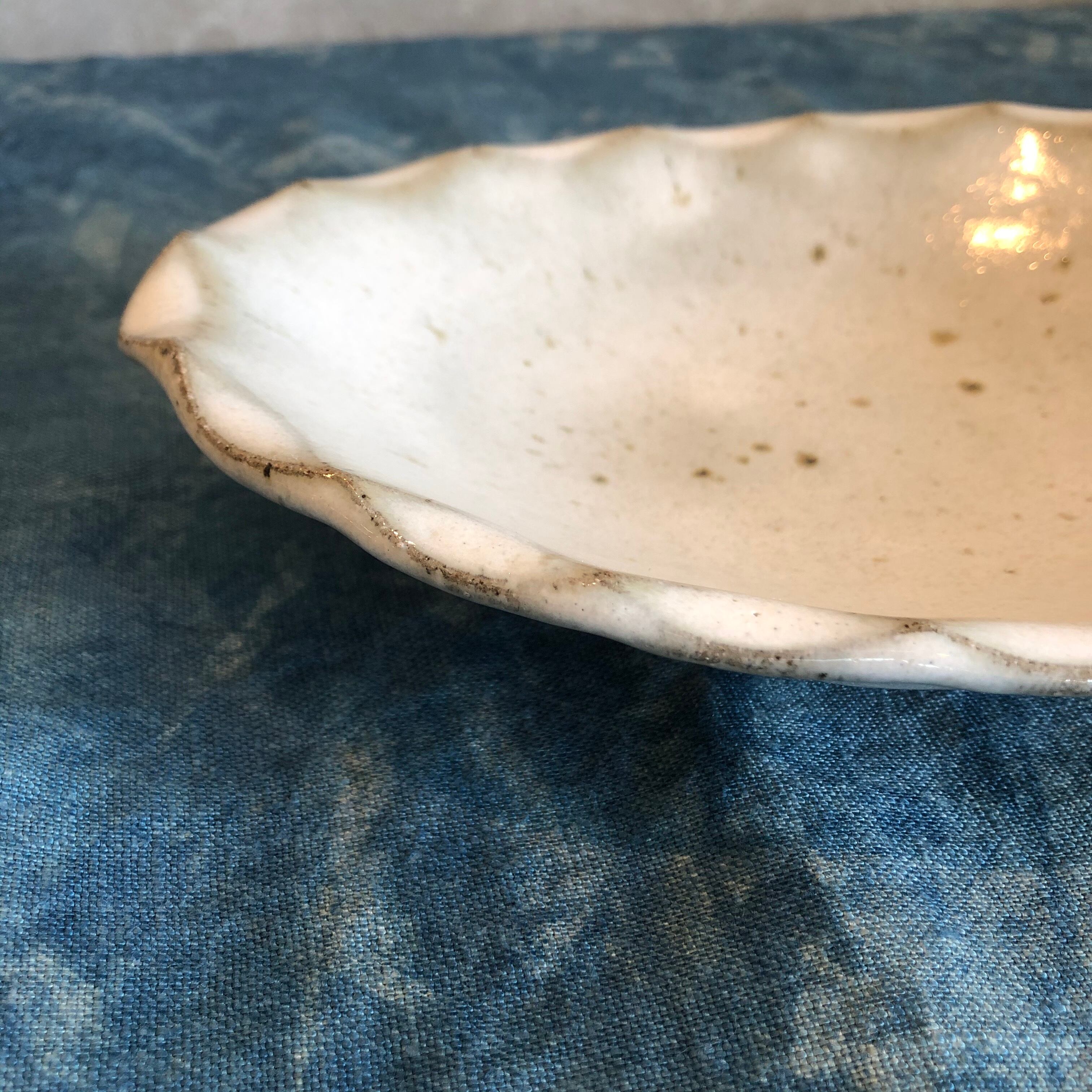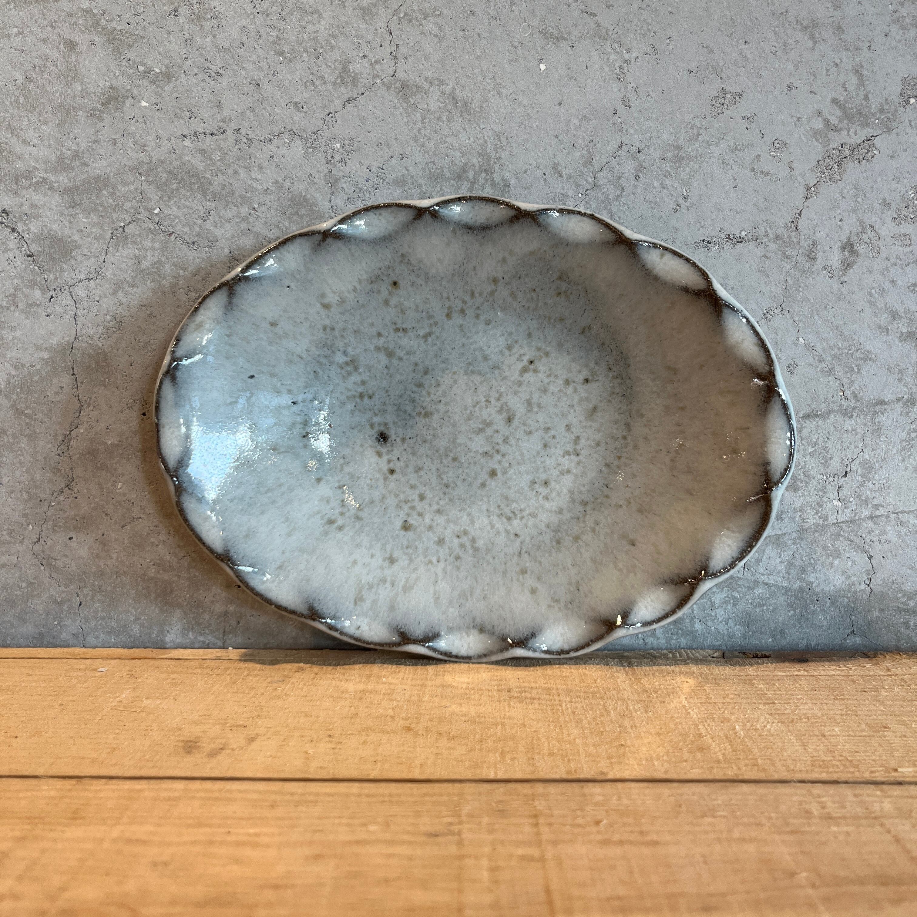 小代焼の伝統的な藁灰釉を用いて作られた楕円皿。少し深さがあるので、和え物やサラダにもよし。縁はなみなみとした装飾が施されており、シンプルな中にもさりげないデザインの一枚です。