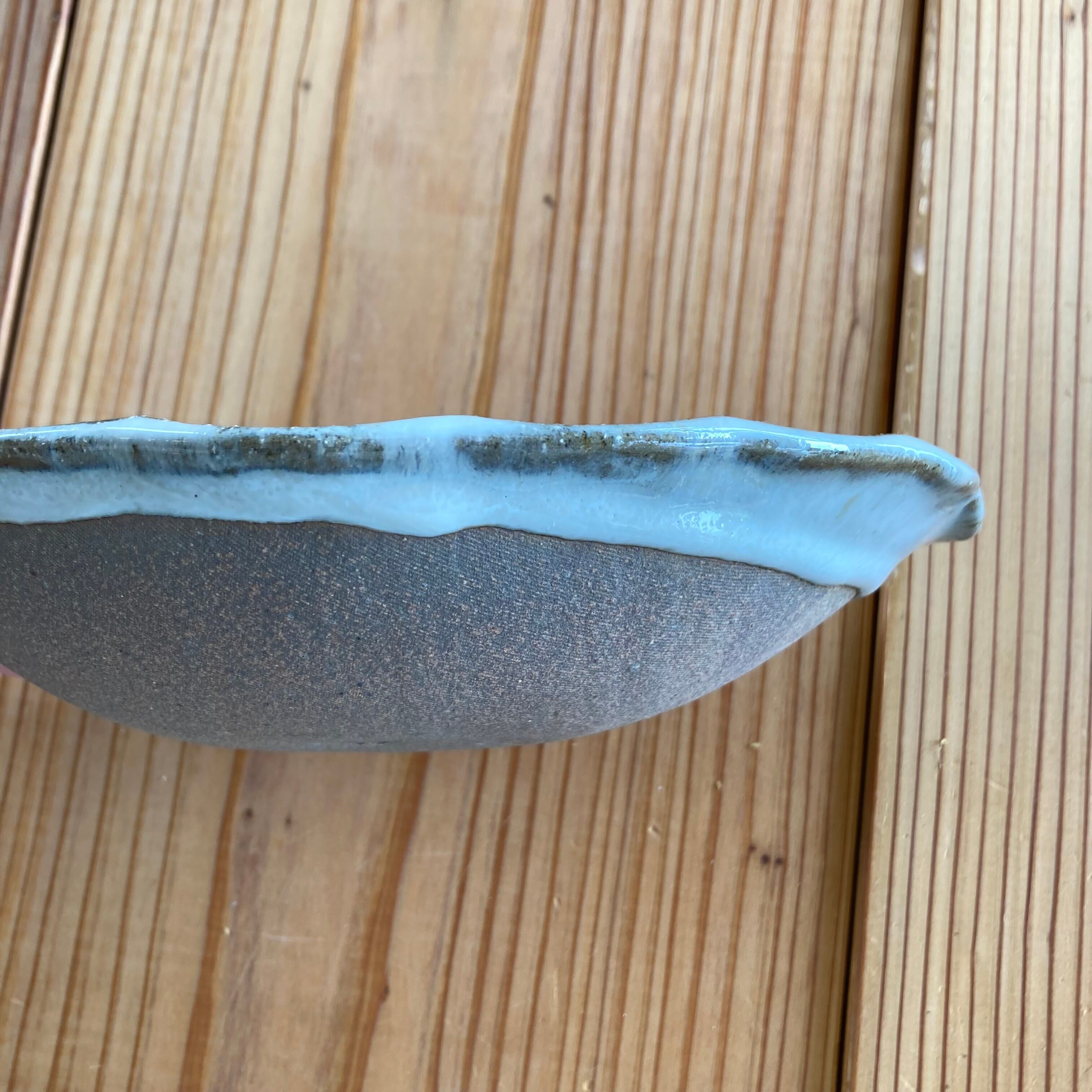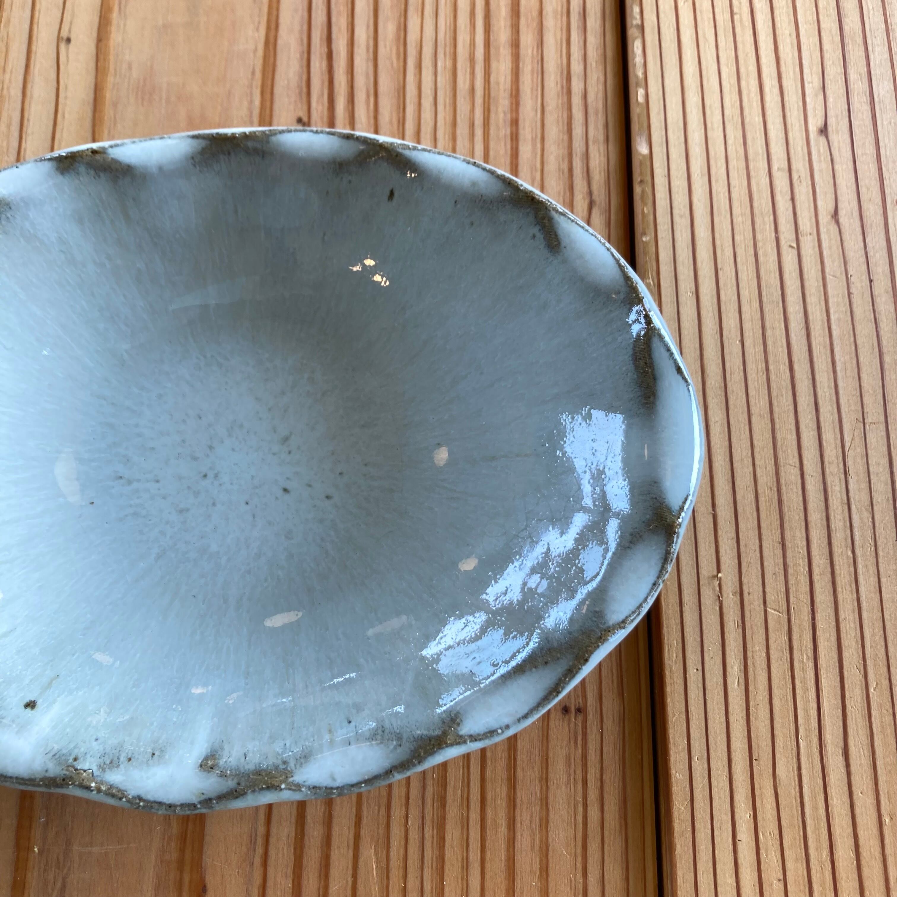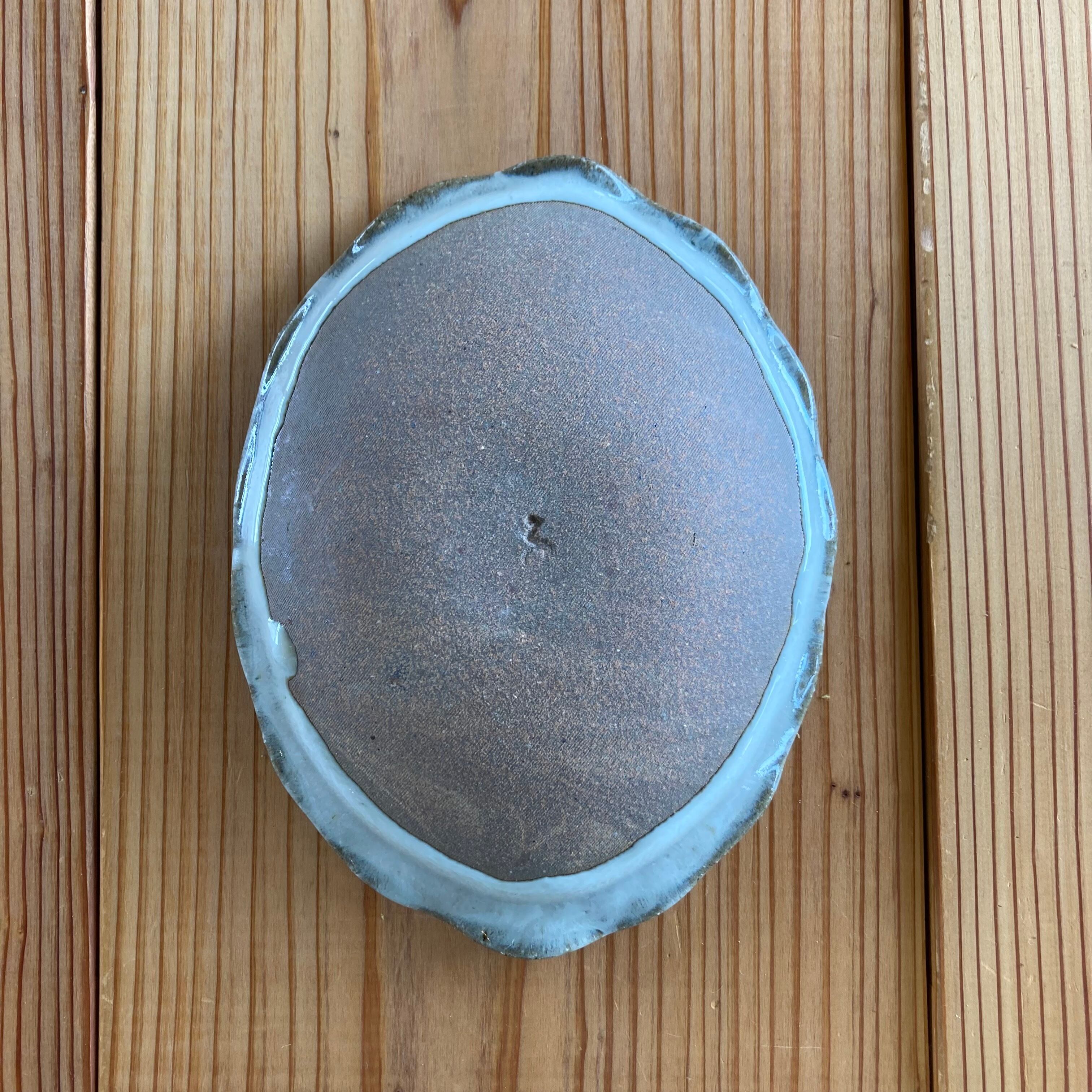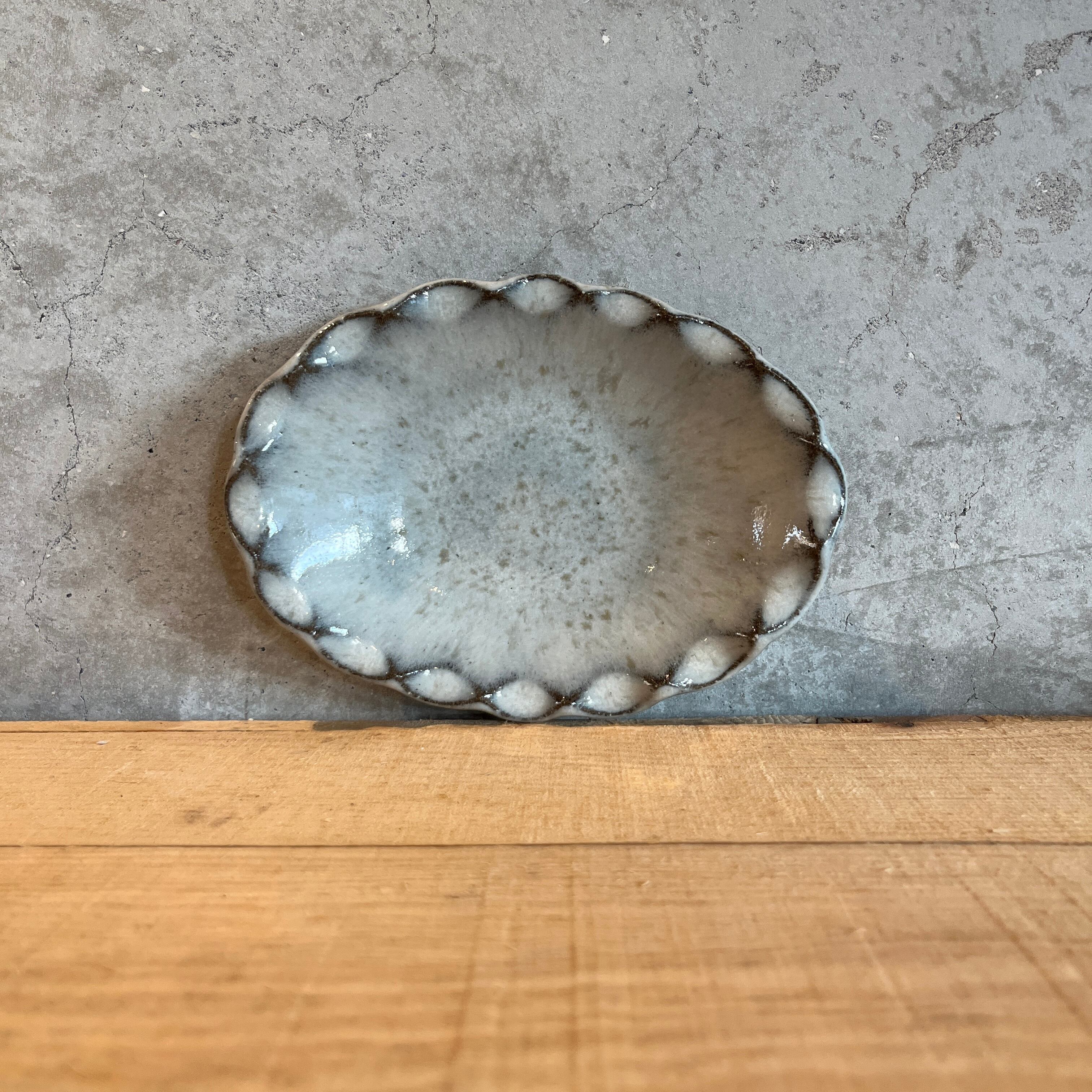 小代焼の伝統的な藁灰釉を用いて作られた楕円皿。縁はなみなみとした装飾が施されており、シンプルな中にもさりげないデザインの一枚です。小代瑞穂窯 福田るいさんの楕円皿です。