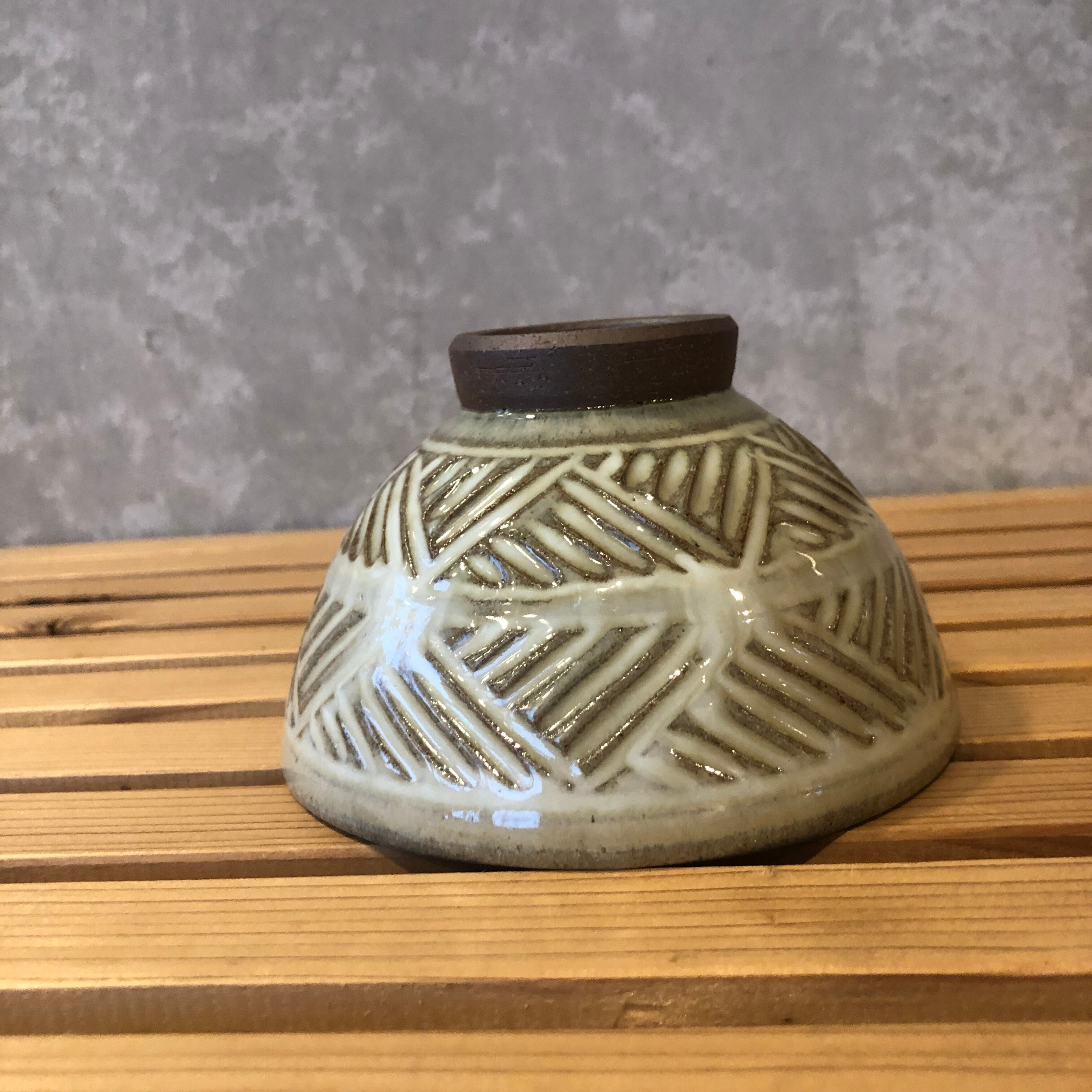 藁灰釉の奥行きある色合いが魅力的。大きめサイズの飯碗に施された檜垣文がうっすらと浮かび上がり、趣ある器に。小丼としても良さそうです。