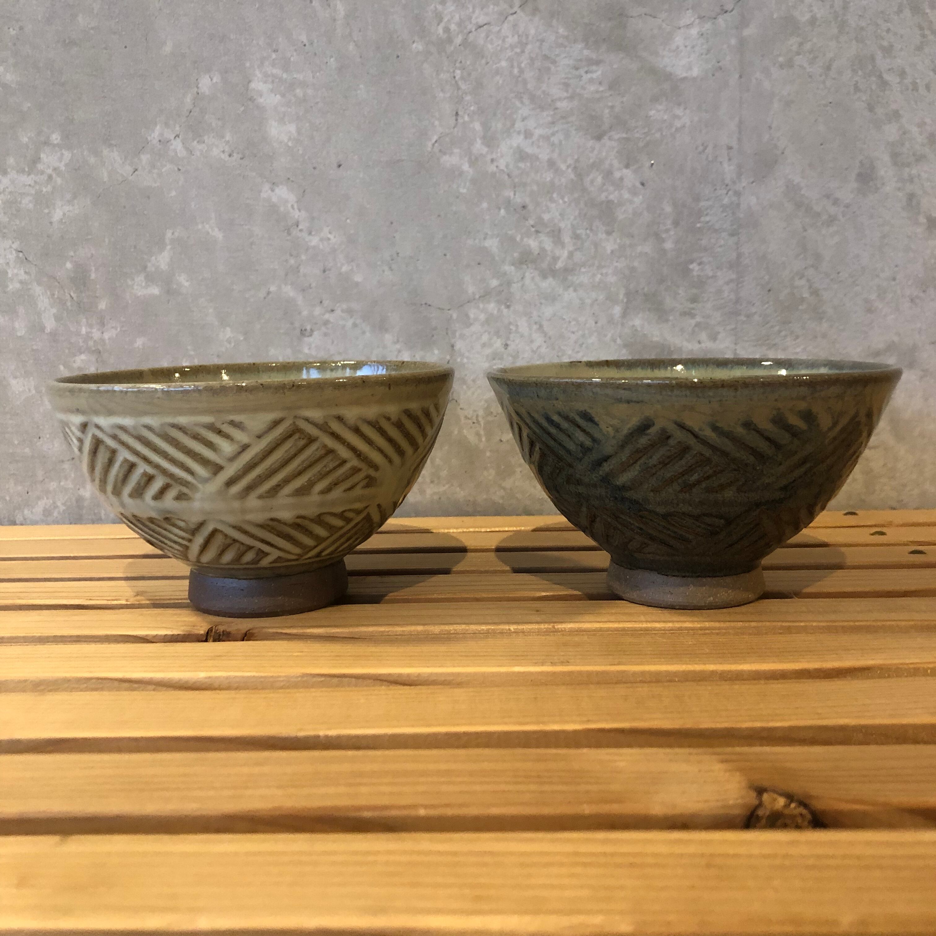 藁灰釉の奥行きある色合いが魅力的。大きめサイズの飯碗に施された檜垣文がうっすらと浮かび上がり、趣ある器に。小丼としても良さそうです。
