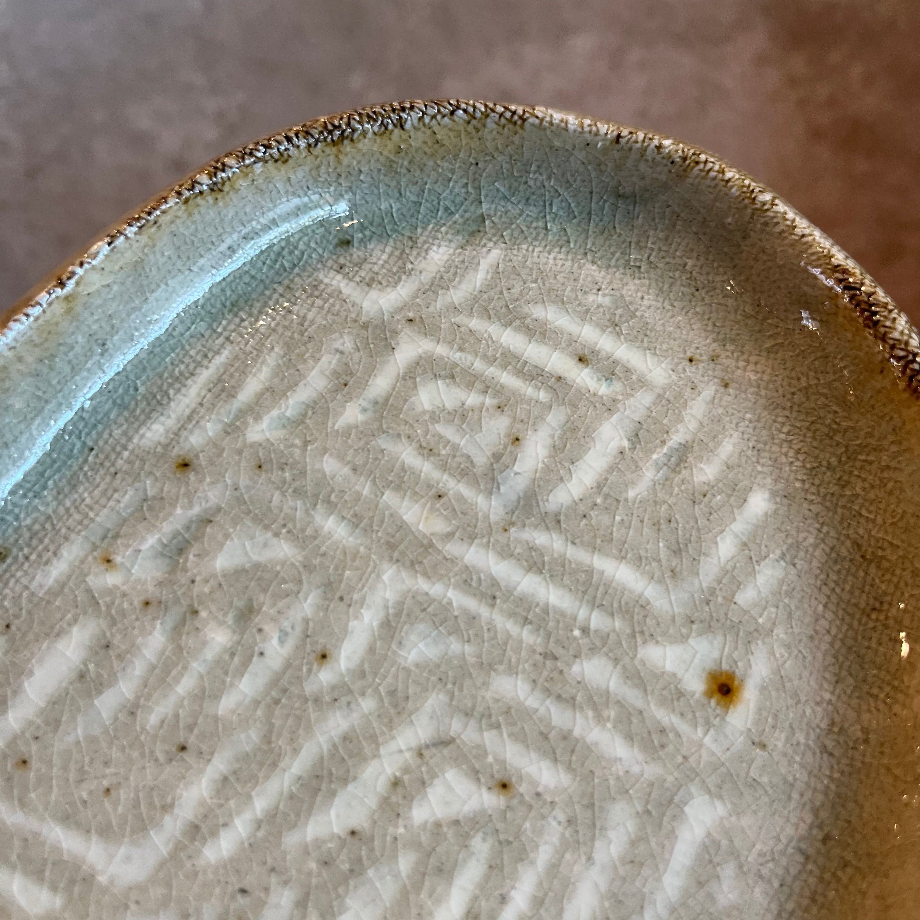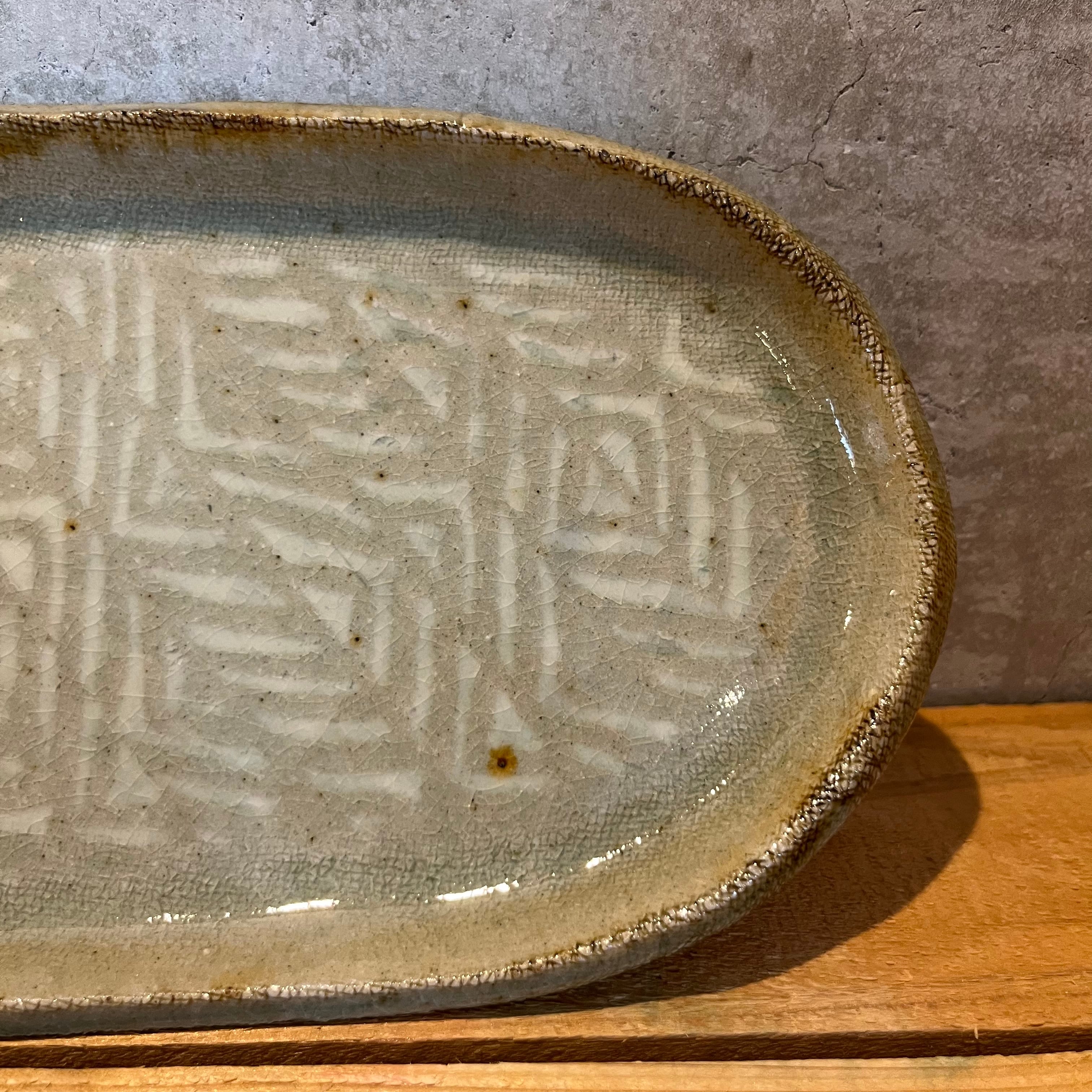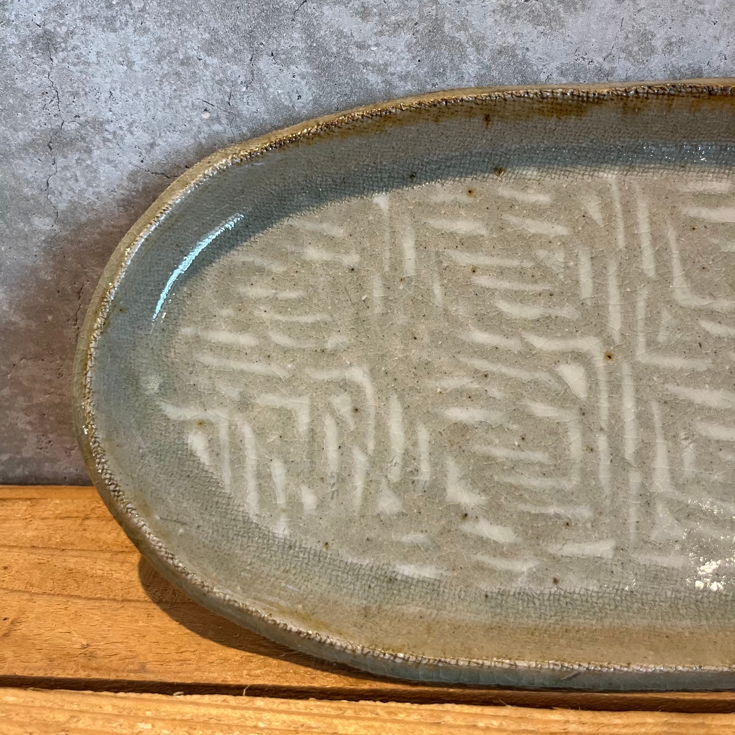 まゆみ窯の象嵌楕円皿です。まゆみ窯さんの代表作でも象嵌シリーズ。ひとつひとつ丁寧に模様を彫った後に化粧土で埋めてその上に釉薬をかけることで模様を出す象嵌という技法で作られています。お魚をのせるのにぴったりです。
