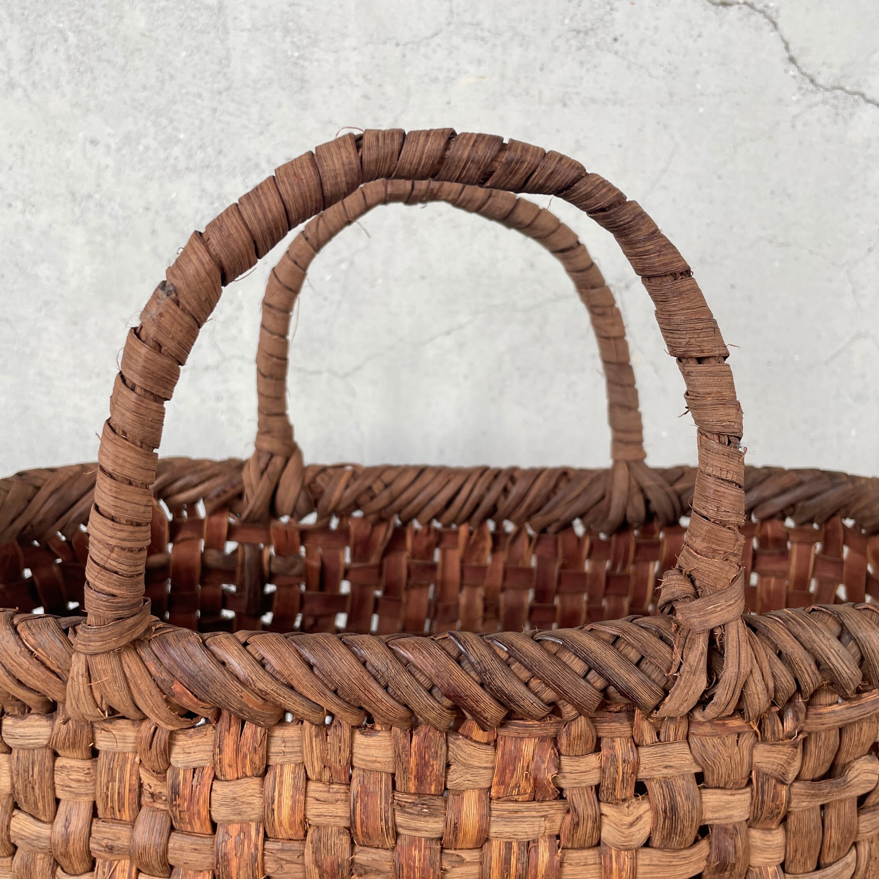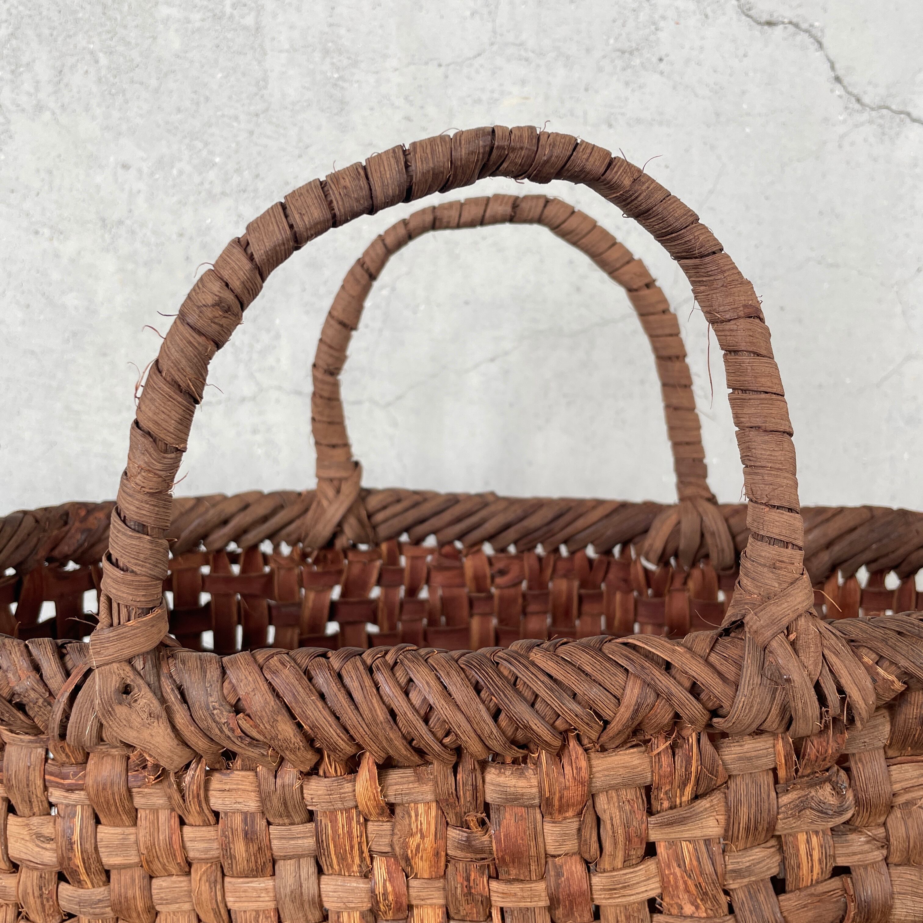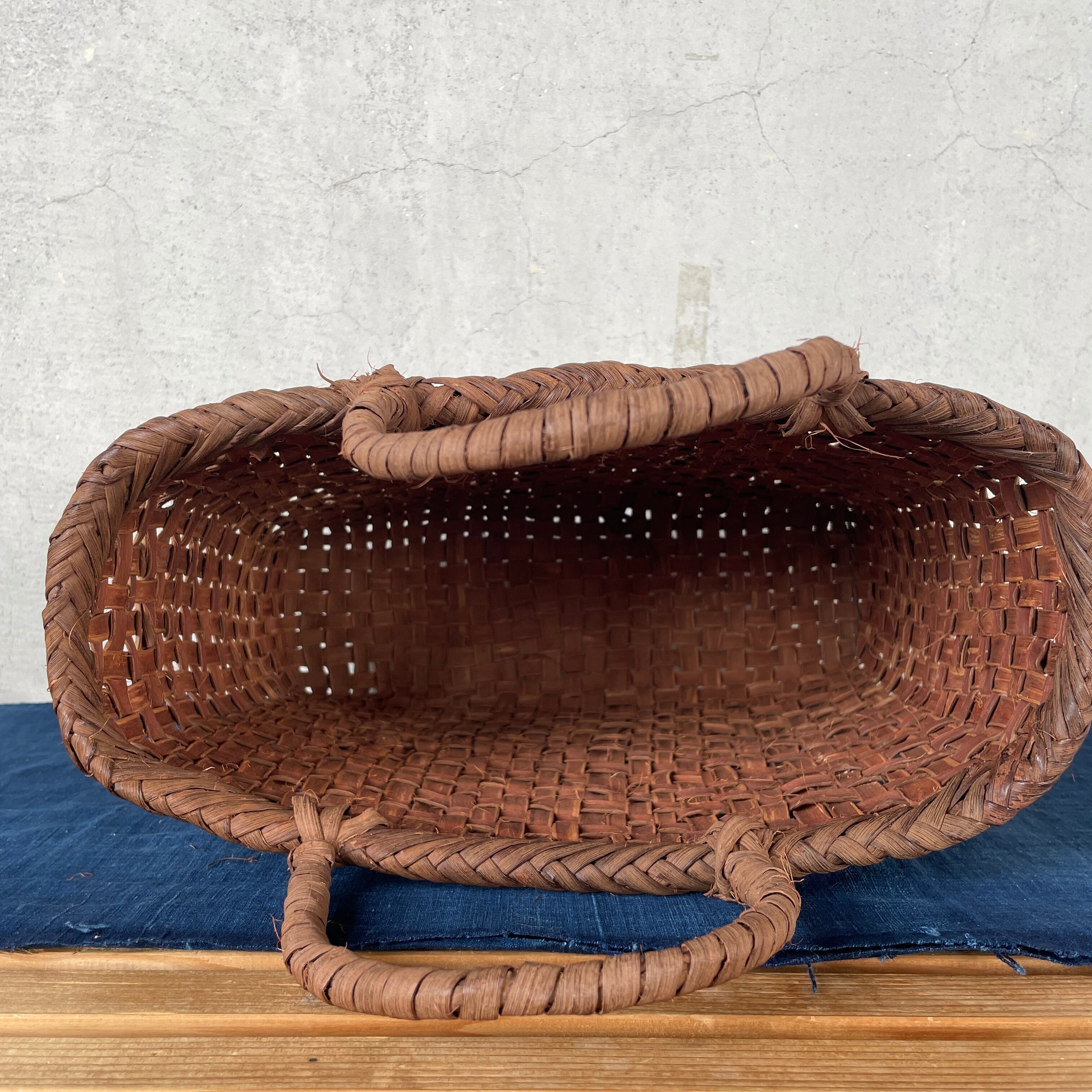 福島の奥会津地方に伝わる編み細工です。すべて現地にて仕入れております。寒暖の差が激しいこの地域では良質な山葡萄の蔓皮が採取できます。山葡萄の蔓皮は一年の内で梅雨時期のたった二週間ほどしか取れないためとても貴重な材料です。良質な山葡萄は使い込むことでまるでレザーのような経年劣化がお楽しみいただけます。